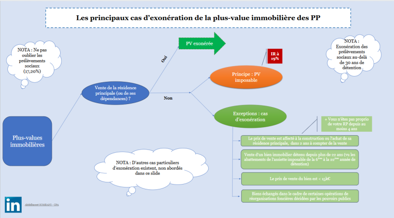 ✅ La cession de la résidence principale est exonérée. Plusieurs autres situations d'exonération existent.