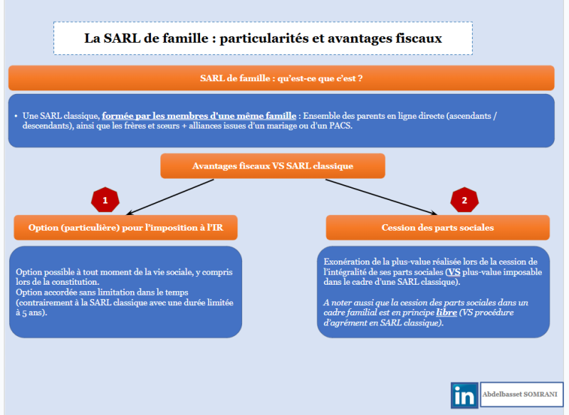 ☑ D'un point de vue fiscal : La SARL de famille se distingue de la SARL classique, principalement, par les deux avantages fiscaux ci-dessous, qui ne sont pas négligeables et peuvent dans certaines circonstances et/ou dans le cadre de certaines activités spécifiques, contribuer à des optimisations fiscales intéressantes :