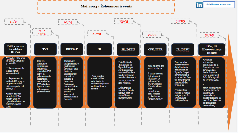 ➡ Voici par ailleurs, dans l'infographie ci-dessous, un rappel récapitulatif des différentes échéances fiscales à venir sur le mois de mai 2024.